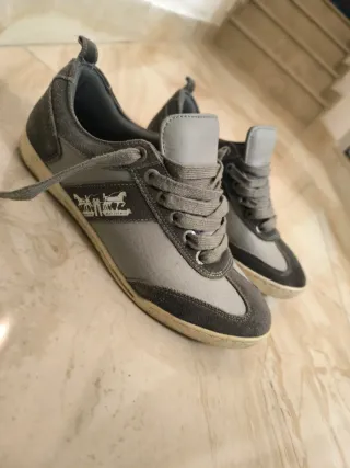 Scarpe da ginnastica in tonalità di grigio, con dettagli in camoscio e logo a cavallo. Marca Levi's, non usate indossate solo una volta. Comprate nel 2023 a Siracusa. Posso fare video per altre info. Sono disponibile. - Tomaia in camoscio e tessuto. - Dettagli in pelle. - Suola in gomma.