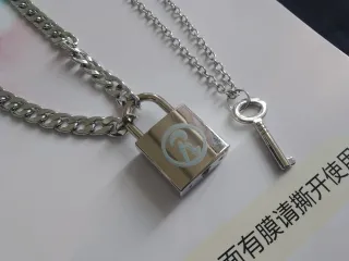 Set di collane Nana e Ren con ciondoli a forma di lucchetto e chiave. - Design a doppio strato. - Finitura color argento lucido. - Lucchetto con logo inciso.