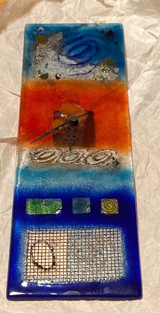 Orologio da parete realizzato in vetro fuso con un design moderno e colorato. Le sue dimensioni sono 45x15,5 cm. - Vetro fuso multicolore. - Design astratto con diverse texture. - Adatto per decorare qualsiasi ambiente. L'orologio è dotato di un Qaurzuhrwerk, sul quale c'è anche un gancio. È necessaria una batteria.