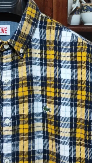 Camicia a maniche lunghe con un classico motivo a quadri. - Fantasia a quadri gialla, blu e bianca. - Logo Lacoste ricamato sul petto.