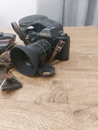 Macchina fotografica analogica Canon T50, un classico per gli appassionati. - Obiettivo Canon Zoom Lens FD 35-70mm 1:3.5-4.5. - Flash Canon Speedlite 155A. - Custodia in pelle per la macchina fotografica. - Custodia in pelle per il flash. - Tappi copriobiettivo. - Filtro. - Tracolla.