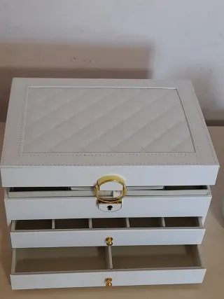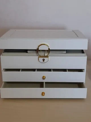 Elegante portagioie bianco con finiture dorate, perfetto per organizzare i tuoi gioielli. - Design trapuntato sul coperchio. - Chiusura a scatto con chiave. - Tre cassetti estraibili con divisori. - Maniglie dorate sui cassetti.