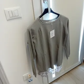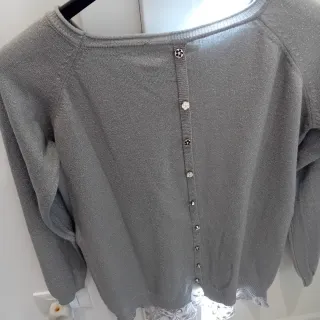 Maglioncino da donna con un design elegante e raffinato. - Tessuto leggermente scintillante. - Dettagli in pizzo bianco sul fondo. - Scollo rotondo.