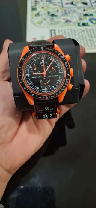 Orologio Omega Bioceramic MoonSwatch. - Cassa in bioceramica. - Quadrante nero. - Dettagli arancioni. Lancette fluorescente, cinturino regolabile a strappo