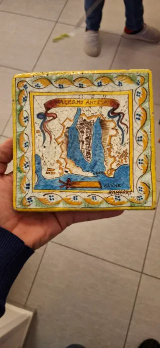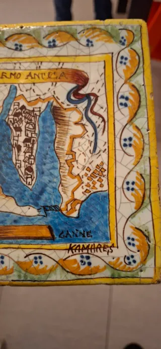Piastrella decorativa in ceramica con la mappa di Palermo Antica. Un pezzo unico per gli amanti della storia e dell'arte. - Disegno dettagliato della città antica. - Bordi decorati con motivi floreali. - Firma Ganne Kamares sul fondo.