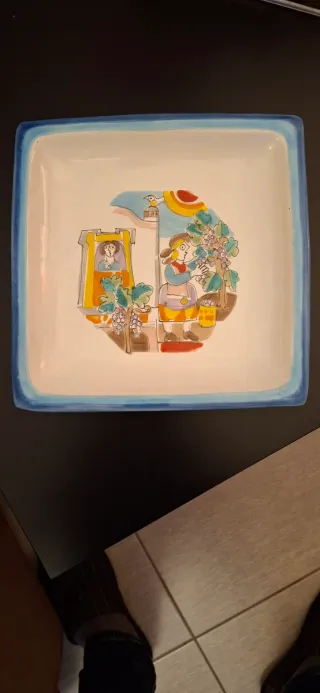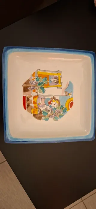 Si tratta di un piatto svuotatasche in ceramica di De Simone, un pezzo da collezione che commemora il XX Congresso Internazionale A.N.M.I.R.S. tenutosi a Palermo dal 21 al 23 settembre 1995. Questo è un piatto quadrato decorativo in ceramica, dipinto a mano, della linea "Folk" di Ceramiche De Simone. Il piatto, realizzato artigianalmente, raffigura la "Vendemmia"