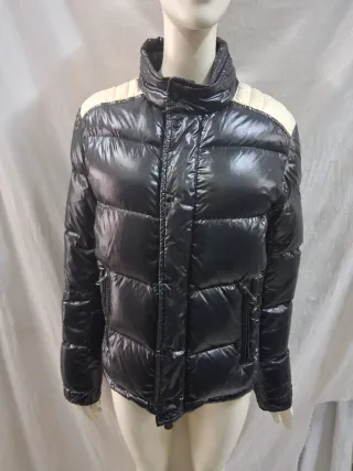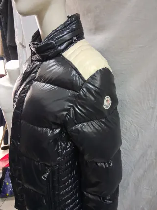 Piumino Moncler in piuma d'oca, un capo caldo e stiloso. - Colore nero lucido con dettagli beige sulle spalle. - Chiusura frontale con bottoni. - Tasche laterali con zip.