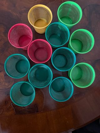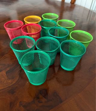 Set di dodici porta bicchieri in metallo, o perfetti per organizzare la tua scrivania o il tuo spazio. 9 sono uguali e 3 ( verde chiaro) sono leggermente diversi . - Design a rete. - Colori vivaci e assortiti. - 6 Verde scuro - z Rossi - 3 Verde chiaro - 1 Giallo Prezzo trattabile.