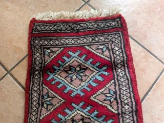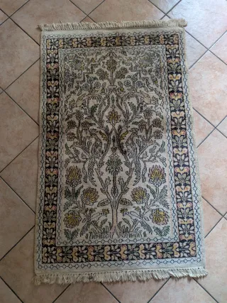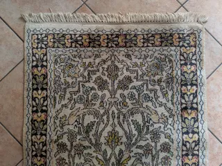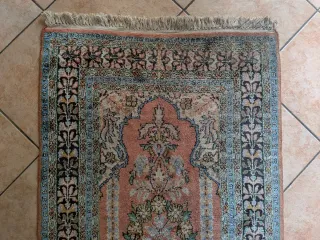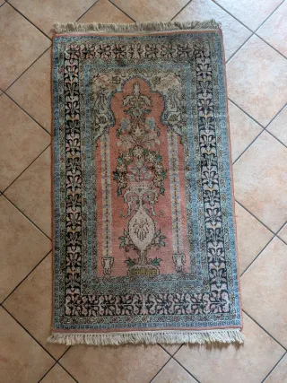 Tappeto orientale di manifattura artigianale annodato a mano in lana e seta su cotone. Il tappeto è robusto, in ottime condizioni.Pulito e igienizzato con metodo domestico. Dimensioni 132x80cm (frange incluse).