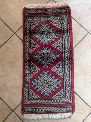 Tappeto orientale di manifattura artigianale annodato a mano in lana e seta su cotone. Il tappeto è robusto, in ottime condizioni.Pulito e igienizzato con metodo domestico. Dimensioni 133x73cm (frange incluse).