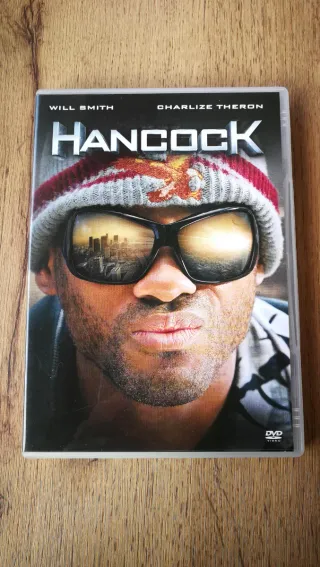 Film Hancock in DVD format. - Starring Will Smith and Charlize Theron. - Action and adventure genre. - Fantasy elements.