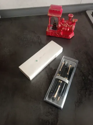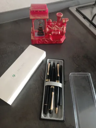 ATTENZIONE LE PENNE NON SCRIVONO BISOGNA SOSTITUIRE L' INCHIOSTRO. Elegante set di quattro penne da collezione, perfette per gli amanti della scrittura. - Colore nero con dettagli dorati. - Custodia inclusa.
