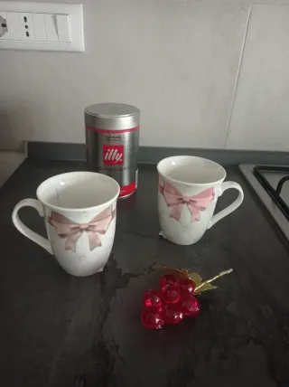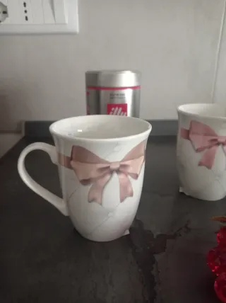 Set di due tazze da tè o caffè, perfette per la colazione o una pausa rilassante. Presentano un grazioso fiocco rosa e un motivo a rombi. - Due tazze incluse. - Design elegante con fiocco. - Motivo a rombi decorativo.