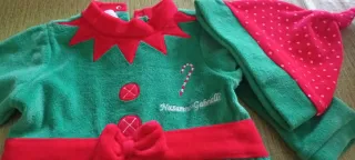 Bellissimo vestito da elfo natalizio carnevale perfetto per le feste,età 12 mesi, nazareno gabrielli - Colore verde con dettagli rossi. - Include cappello abbinato. - Ricamo di un bastoncino di zucchero e nome. - Morbido tessuto tipo peluche.
