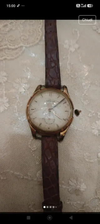 Orologio da polso vintage Merkury con cinturino in pelle. - Cassa color orologio rosa - Quadrante bianco con indici. - Cinturino marrone effetto coccodrillo. Non funzionante