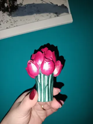 Un mazzo di tulipani profumati, realizzato a mano. - Fiori color fucsia metallizzato. - Gambi verdi metallizzati. Personalizzabile in colori Realizzato in polvere ceramica