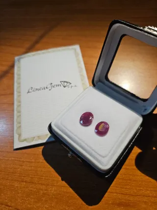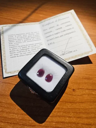 Bellissima coppia di gemme di corindone, varietà rubino. Presentate in un elegante cofanetto, con certificato di garanzia. Regalo una perla di fiume in omaggio. - Colore rosso intenso, 8,9 ct - Taglio ovale. - Perla di fiume in omaggio.