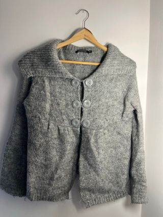 Cardigan grigio con collo largo doppi bottoni in tinta sul davanti ma solo per bellezza ci sono dei gancetti