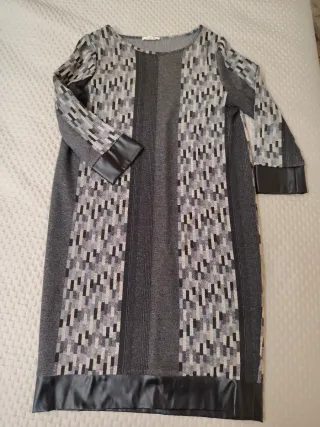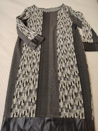 Elegante vestito da donna per la mezza stagione, con un'originale fantasia geometrica. - Maniche lunghe con dettagli in ecopelle. - Fondo del vestito con bordo in ecopelle. - Design a pannelli con diverse texture.