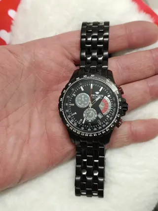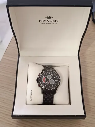 Elegante orologio Pryngeps Milano con funzione cronografo, con BATTERIA DA SOSTITUIRE. - Cassa e bracciale in metallo nero. - Quadrante nero con dettagli rossi e bianchi. - Logo Pryngeps inciso sul quadrante e sul bracciale. - Chiusura deployante.