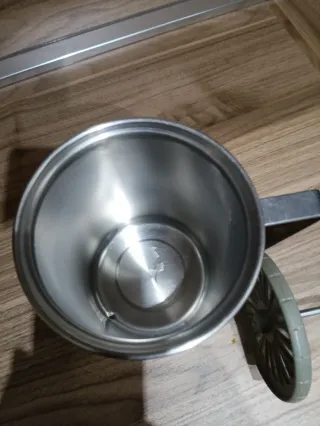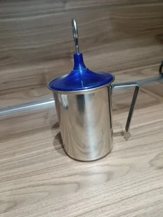 Bollilatte in metallo con coperchio in plastica blu. - Design elegante e funzionale. - Manico in metallo per una presa sicura. - Coperchio con pratico pomello per una facile apertura.