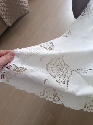 Elegante tovaglia ricamata interamente a mano, pensata per ospitare comodamente 12 persone. Un pezzo unico che aggiunge un tocco di raffinatezza alla tua tavola. - Dettagli ricamati floreali e geometrici. - Bordo con lavorazione a giorno e festonato misura 1,60x 2,80