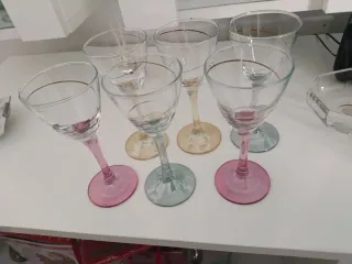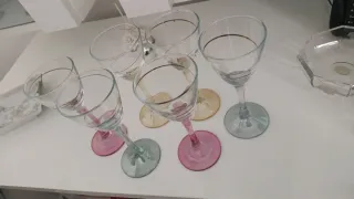 Set di sei calici eleganti con dettagli dorati. - Base colorata in diverse tonalità. - Bordo decorato con un sottile filo dorato.