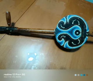 Strumento musicale africano Kora, con un design decorato sul corpo circolare. - Corpo circolare con decorazioni a punti bianchi, blu e marroni su sfondo nero. - Manico in legno. - Parte superiore in legno. - Decorazioni dipinte a mano.