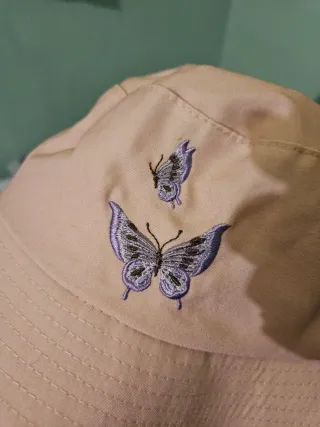 Cappello da pescatore in tessuto rosa con un'applicazione ricamata di farfalle viola. - Design con farfalle ricamate. - Tinta unita rosa.