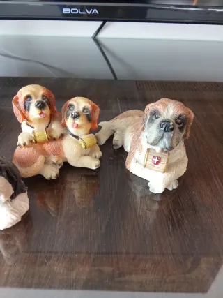 Grazioso set di quattro statuine di cani. - Un cane di razza Bearded Collie. - Due cani di razza San Bernardo. - Un cane con un barilotto al collo.