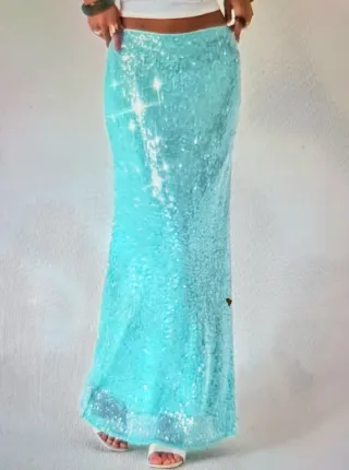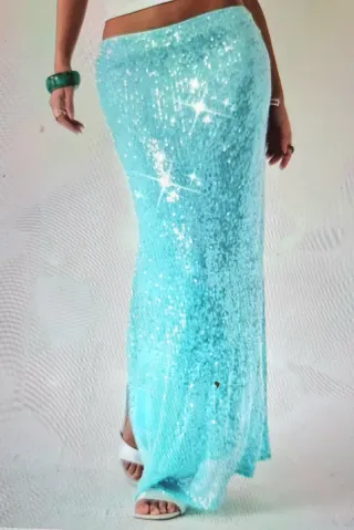 Bellissima gonna lunga con paillettes, in stupendo colore azzuro-turchese, leggera e facile da indossare, un capo di moda, afascinante e sexy, da un efetto Wau....ideale per le feste, festival musicali e vacanze, caratterizzato da un design aderente a vita bassa ..indicata taglia XL, ma andra benissimo anche per le taglie più grande (si allunga benissimo)...nuova