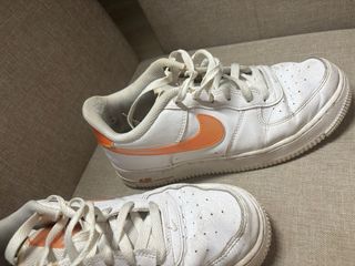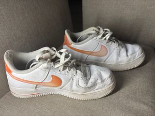 Scarpe sportive Nike Air Force 1. - Tomaia in pelle bianca. - Dettagli color arancio. - Chiusura con lacci bianchi.
