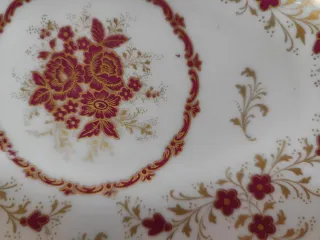 Elegante piatto da antipasto in porcellana con decorazioni floreali. - Dettagli in oro e bordeaux. - Design raffinato.piccola rottura nel bordo.cm22x13