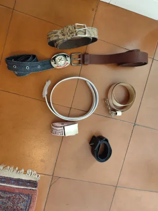 Set di sei cinture di diversi stili e colori. - Cintura in pelle marrone con fibbia in metallo. - Cintura in denim con borchie e fibbia a tema western. - Cintura con fantasia pitonata e fibbia argentata. - Cintura bianca in ecopelle. - Cintura in tessuto rosa con scritte. - Cintura nera in tessuto con fibbia quadrata.