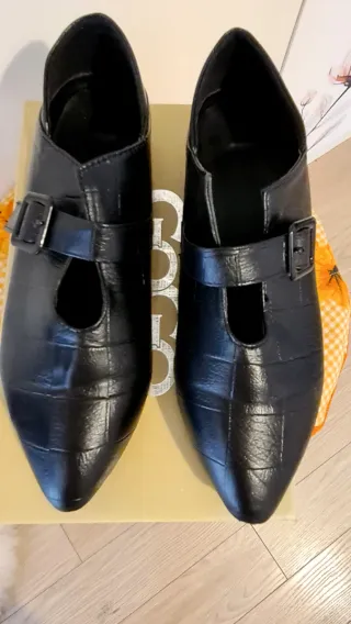 Scarpe con tacco basso,il tacco è decorato con un inserto in metallo argentato, la chiusura permette di regolare la larghezza del piede, l'ecopelle è morbida, il tacco è comodo, nuove, indossate solo per la prova, indicata la taglia 39, ma vera è 38.5 (interno della scarpa 24,5 cm)