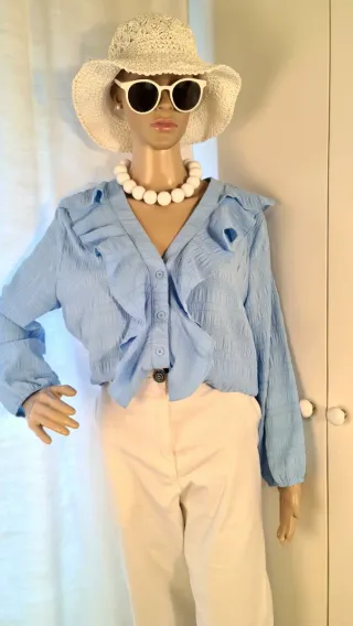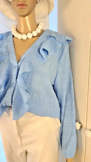 Adorabile camicetta in un bellissimo colore azzurro, molto vivace e allegro, il tessuto; anche sia poliestere, ma è molto leggero, morbido e piacevole al tatto (simile al cotone)... fa un bllissimo efetto con il bianco... nuova