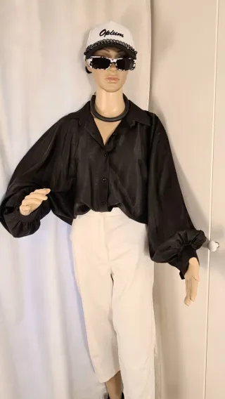 Camicia ampia, con taglio a pipistrello, il tessuto è leggero, leggermente lucido (imitazione seta), ottimo per creare un look di stile fashion con jeans, pantaloni larghi e gonne lunghe.