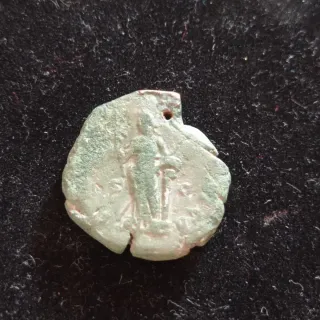Moneta antica da collezione, con un diametro di circa 2 cm. Presenta un foro centrale. - Materiale: Bronzo - Colore: Verde/Rame - Dettagli: Profilo di un personaggio storico inciso