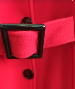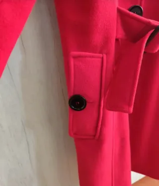 Elegante cappotto da donna in un vivace color rosso. Un capo versatile per ogni occasione. - Tessuto di alta qualità. - Dettagli con bottoni neri. - Cintura in vita per una silhouette definita.