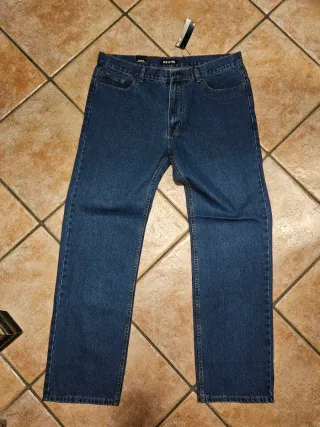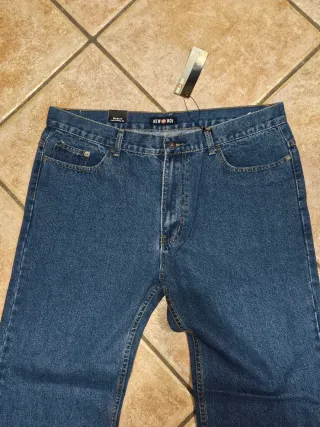 Jeans classici in denim blu. Taglia ITA 56, EU 52 - Vestibilità comoda. - Design a 5 tasche. - Chiusura con zip e bottone.