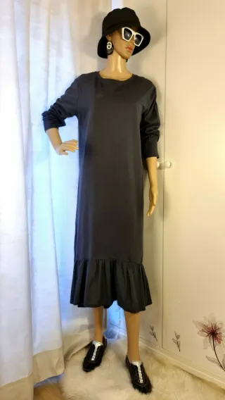 Abito lungo e ampio in stile boho, nobile colore grigio scuro, realizzato in 100% cotone. È comodo e fresco. Puoi indossarlo con una cintura e portarlo più corto. Insomma, puoi usare la tua fantasia per creare look diversi. Nuovo. Altezza manichino: 170 cm.