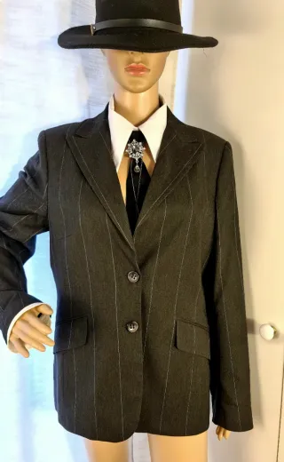 Ottimo blazer classico in un elegante grigio con una sottilissima riga chiara, che la rende adatta a un rigoroso dress code da ufficio. Ottima sartorialità, vestibilità superba, piccole spalline che accentuano perfettamente la silhouette. Il mix composito di viscosa e poliestere garantisce una lunga durata. In ottime condizioni, indossato solo un paio di volte.
