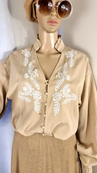 Graziosa camicia in un piacevole tonalità sabbia, impreziosita da ricami a contrasto. Le maniche a sbuffo sono rifinite da un alto elastico al polso, che dona un raffinato effetto arricciato. La camicia ha un bellissimo aspetto con pantaloni bianchi a gamba larga. Il capo è perfetto per un look sofisticato e femminile Nuova ...