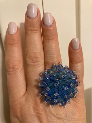 Originale e appariscente anello con cristalli azzurri montato su una base in metallo anallergico e regolabile. Adatto alla bella stagione estiva. Fatto a mano.