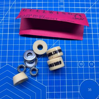 Set di gommini/bushing vintage per skateboard Gullwing Cushion. - Colore bianco panna. - Logo Gullwing stampato in nero.