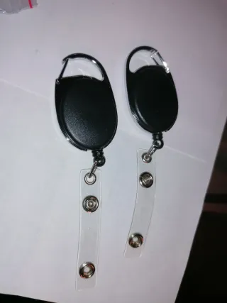 Vendo 2 Pratici moschettoni con cordino retrattile, ideale per agganciare chiavi o badge. - Moschettone in metallo argentato. - Custodia rotonda nera. - Cordino nero estensibile.