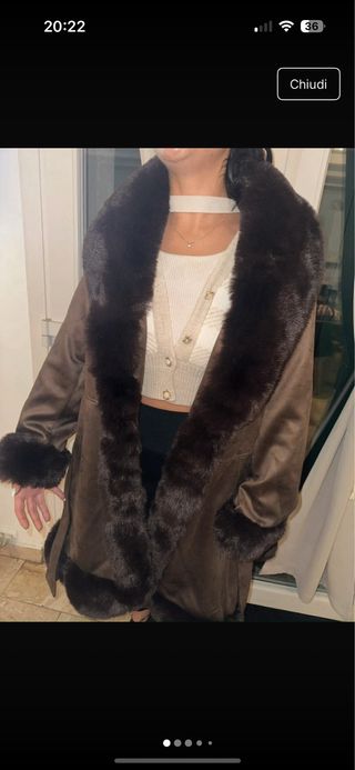 Elegante giacca lunga con dettagli in pelliccia sintetica. - Chiusura con cintura. - Polsini e colletto in pelliccia. - Tessuto morbido al tatto.