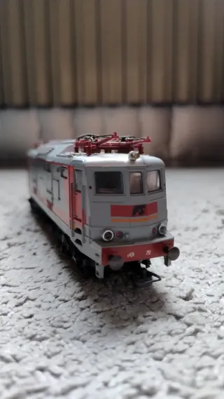 Modellino di locomotiva elettrica Lima rara E424 FS - Colore grigio con dettagli rossi e arancioni. - Pantografi rossi sul tetto. - Dettagli delle ruote e del telaio.