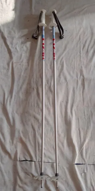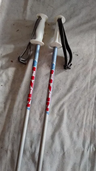 Coppia di bastoncini da sci con design a righe blu e bianche. - Impugnatura ergonomica bianca. - Laccetti di sicurezza neri e grigi. - Design con scritte rosse e blu.