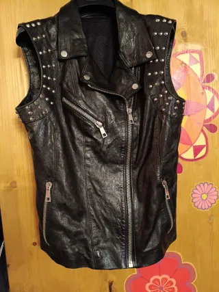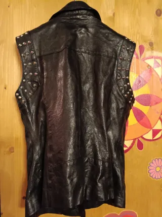 Giacca smanicata in vera pelle, un capo dallo stile audace e grintoso. Giubbino smanicato con borchie vera pelle lunghezza cm 60 spalle cm 40 torace cm 44 ottima vestibilità usato poco - Dettagli con borchie metalliche sulle spalle. - Chiusura centrale con zip. - Tasche laterali con zip.